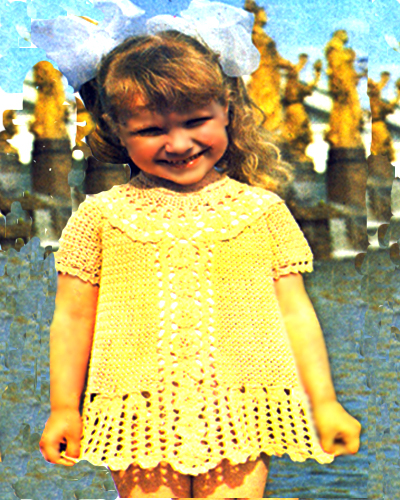 Рукав. Вяжите по схеме 1. Низ отделайте тесьмой, сшейте перед и спинку, вшейте рукава, а затем пришейте кокетку.