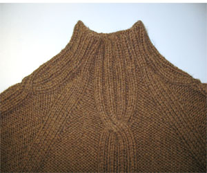 Свитер связан снизу. Связав вкруговую спинку и перед, а также рукава до проймы, все собирается на круговые спицы и вяжется по кругу,убавляя по регланным линиям через ряд.