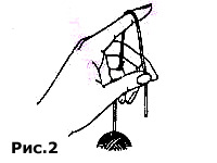 Конец рабочей нити при вязании перекидывается к себе через указательный палец левой руки и прижимается большим пальцем (рис. 2). Нить, идущая от клубка, вкладывается внутрь ладони с согнутыми пальцами. Безымянный палец и мизинец должны постоянно удерживать рабочую нить, давая правильное натяжение. Средний палец должен быть подвижным по мере .необходимости, он помогает удерживать или рабочую нить, или вязанье.